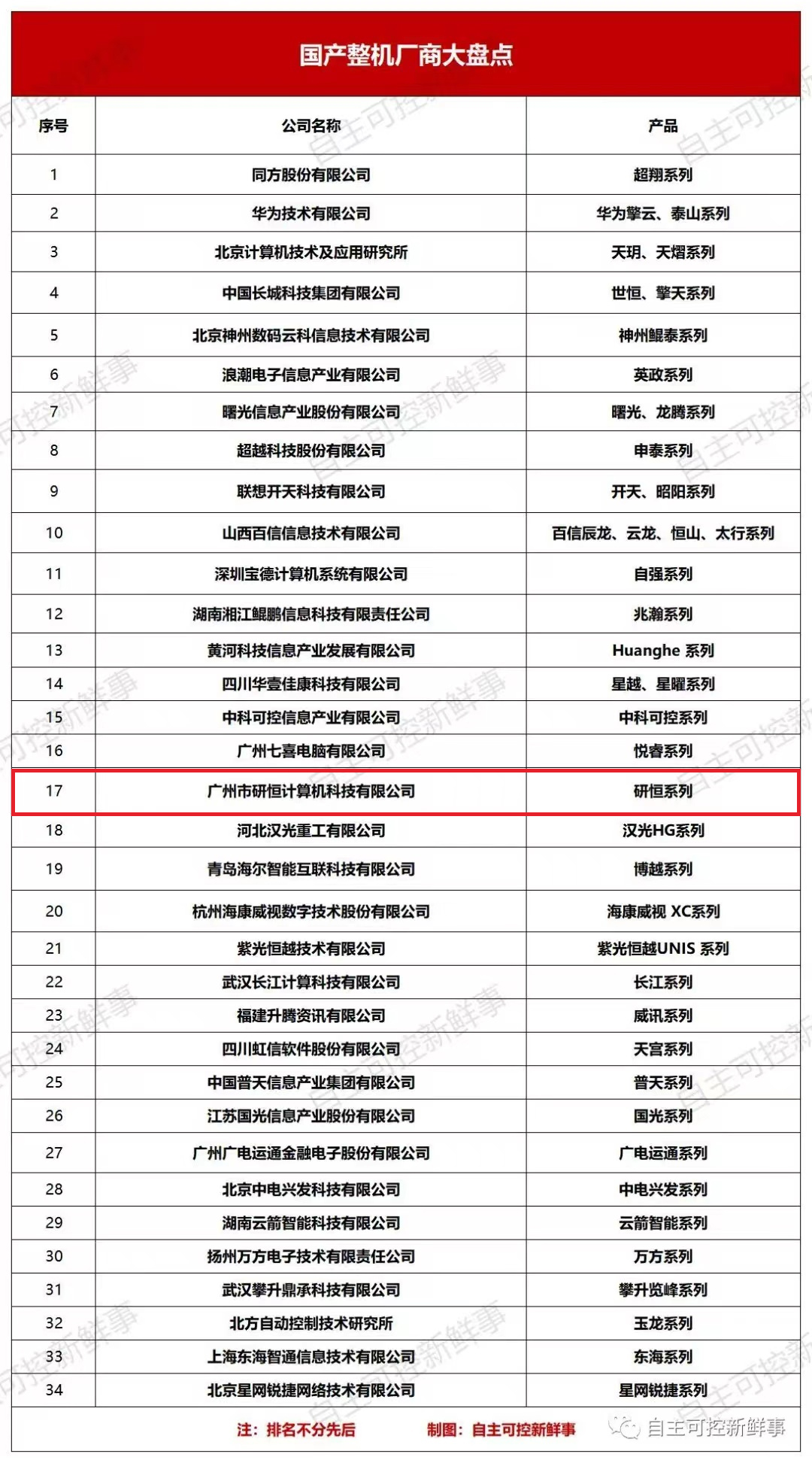 在本次項目中,廣州研恒作為工控行業(yè)第一家進入國家信創(chuàng)名錄的企業(yè),與華為技術有限公司、聯(lián)想開天科技有限公司、寶德計算機系統(tǒng)股份有限公司、浪潮電子信息產業(yè)股份有限公司等21家國內頭部企業(yè)一起參與了報價競標。