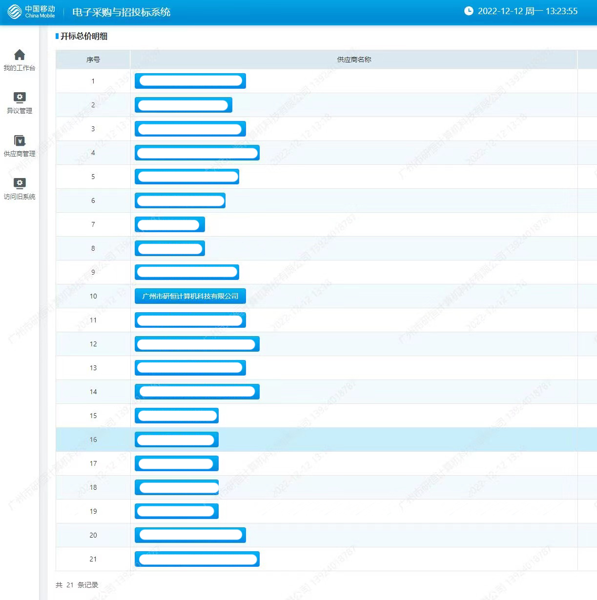 近日,廣州市研恒計算機科技有限公司(以下簡稱“廣州研恒”)在中國移動2022年至2023年桌面筆記本電腦及臺式機電腦產品集中采購項目投標過程中獲得報價第一名。