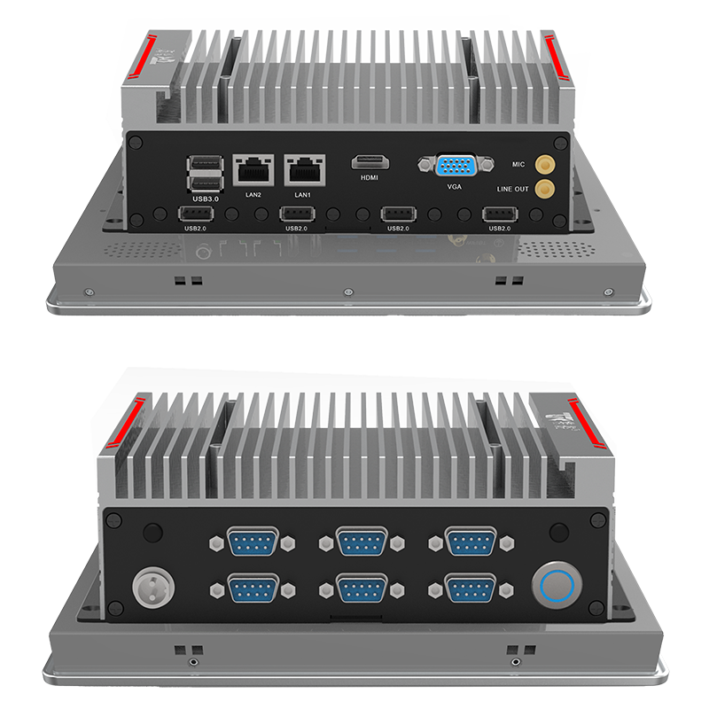 外觀設計:鋁合金一體成型,工藝精細,科技時尚低功耗:英特爾®賽揚®J1900 板載處理器,TDP 10W穩(wěn)定可靠:純工業(yè)無風扇設計,大面積鋁鰭散熱,箱體材質(zhì)可抗接觸式6Kv強電磁干擾;液晶屏接觸處加強型密封膠圈設計,面板防水防撞擊接口豐富:2*LAN(Intel),6*COM,1*USB3.0,5*USB2.0,1*HDMI,1*VGA,1*MIC In, 1*Line